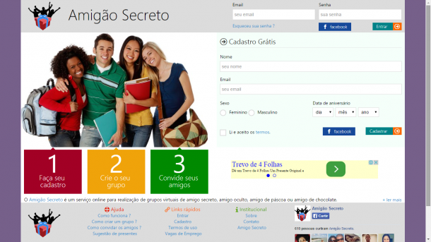 Esse também faz o sorteio, o processo de cadastro é o mesmo, uma pessoa cria um grupo e adiciona os amigos pelo e-mail ou pelo Facebook, A diferença é que neste não é necessário o encontro entre todos do grupo para realizar o sorteio. Quando você é convidado para participar, você entra no site e confirma a participação no grupo. Quando o grupo for fechado o sorteio vai ser feito e você pode ver pelo site ou pelo e-mail que cadastrou quem é o seu amigo secreto. Outra coisa legal é que é possível programar para que combinações não sejam possíveis, pra evitar que um casal de namorados tirem um ao outro, ou então irmão, etc.