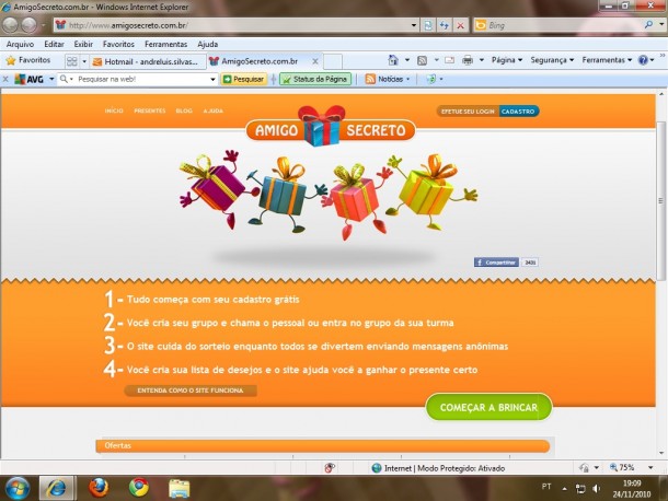 Você se cadastra no site e pode criar um grupo ou entrar em um grupo que já existe, e convidar seus amigos. Você cria seu evento que passar a ter um mural próprio. É bem interativo. Você define o valor dos presentes e monta uma lista de sugestões de presentes. O site mostra uma vitrine de presentes, você vai lá e filtra pelo valor do presente definido pelo grupo. O grupo vai ter um moderador. Esse moderador define a data e a hora do sorteio e o site vai enviar um e-mail para todos com o resultado individual, o famoso quem saiu com quem. Outra opção do site é um guia de bares e restaurantes como sugestão de local para a realização da brincadeira. É o planejamento completo da brincadeira.