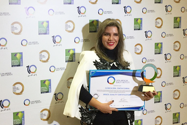 Bom dia, pessoas lindas. Ontem foi um dia muito especial. Recebi o Prêmio Internacional Brazil Quality Summit – Empresa Brasileira do Ano 2017. Quem me acompanhou pelo Instagram sabe o quanto fiquei emocionada! Esse prêmio acontece em toda America Latina e consagra grandes empresas de cada país que se destacam nacionalmente e internacionalmente por suas práticas nas áreas de qualidade e responsabilidade social. E a Clínica Dra. Cintia Cunha foi reconhecida pelo Instituto Latino Americana (American Quality Institute – LAQI).
