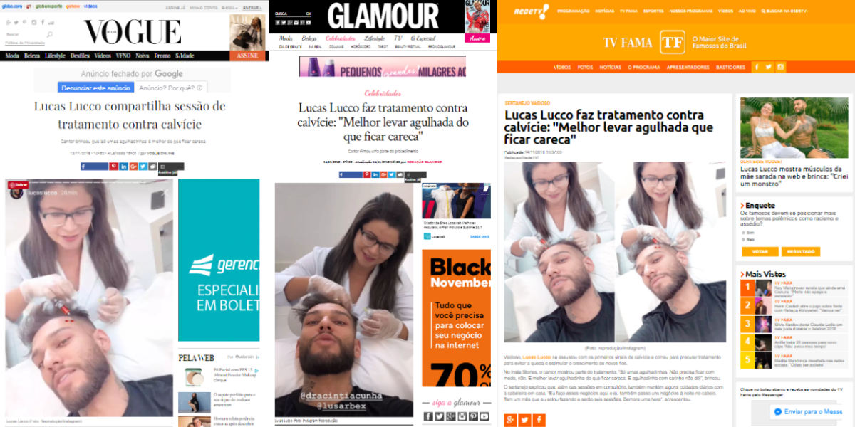 O cantor Lucas Lucco faz tratamento contra calvície aqui na Clínica. Ele brinca que “só umas agulhadinhas é bem melhor que ficar careca”. E está certo né? A terapia capilar pode ser um pouquinho incômoda, por conta das aplicações de vitaminas e fatores de crescimento, mas tem feito muito sucesso com os nossos pacientes, com resultados significativos após algumas sessões.