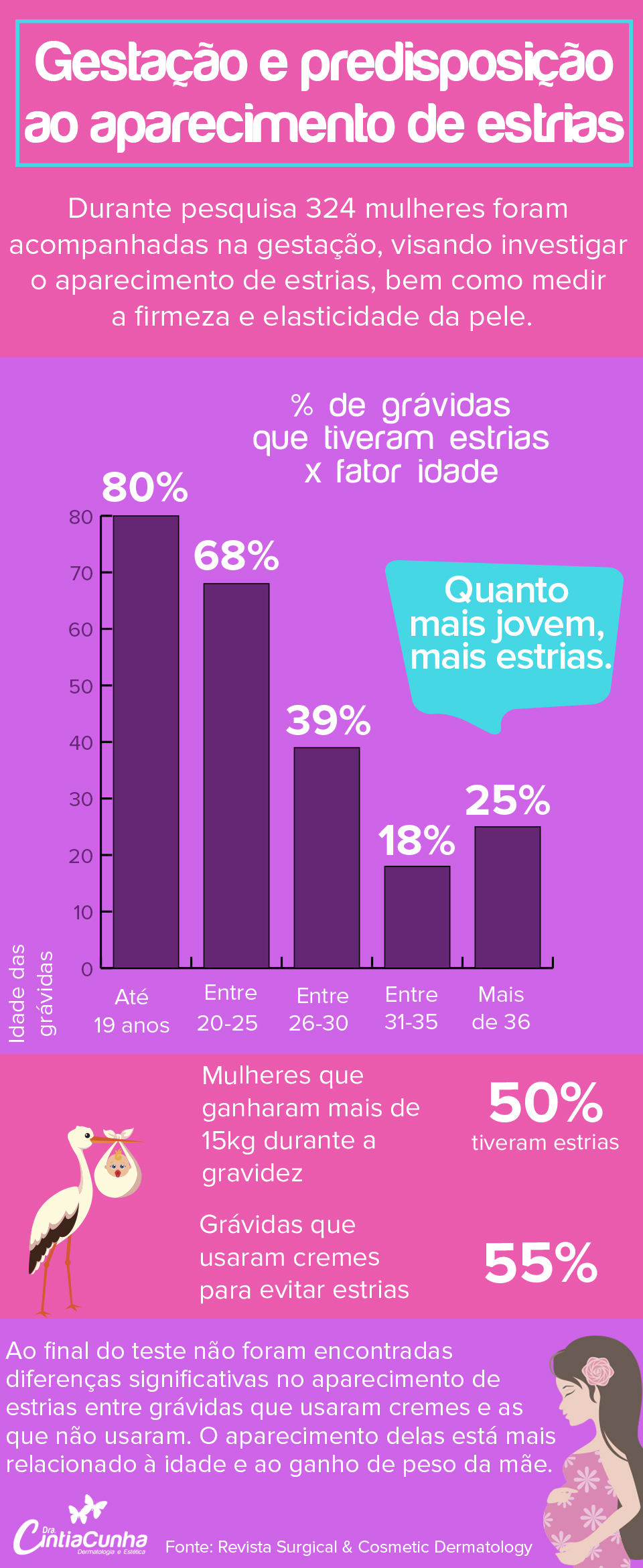 Fui pesquisar mais sobre o assunto e encontrei um estudo muito interessante, divulgado na revista científica Surgical & Cosmetic Dermatology. Eu gosto muito de acompanhar essas novidades e, claro, contar tudo pra vocês. Nesse estudo participaram mais de 300 grávidas durante os meses de gestação. Foram avaliados vários fatores, como peso da mãe e do bebê, idade, se fez uso de cremes, entre outros. Para simplificar os resultados, fiz esse infográfico para mostrar pra vocês: