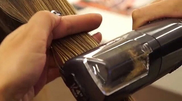 Ele funciona com o Split-Ender-Pro, que é uma maquininha com sistema automático de corte que tem pentes niveladores entre lâminas. Assim ele remove apenas os fios que estão ressecados ou com pontas duplas! Demais, não é? O cabelo fica livre dessas pontinhas e não tem o tamanho alterado!